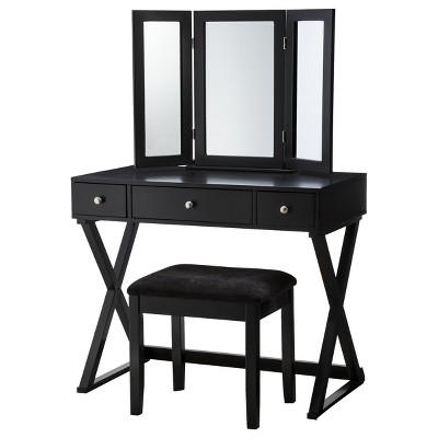Black Makeup Vanity Table Set Tri Folding Mirror Makeup